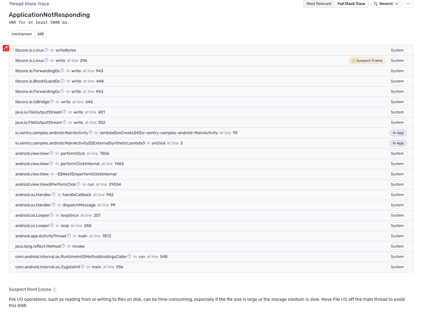 If an ANR is connected to one of the Performance Issues detected by Sentry (for example, File I/O on Main Thread or DB on Main Thread), the offending span will be linked to the ANR event, showing you exactly which slow operation is to blame.
