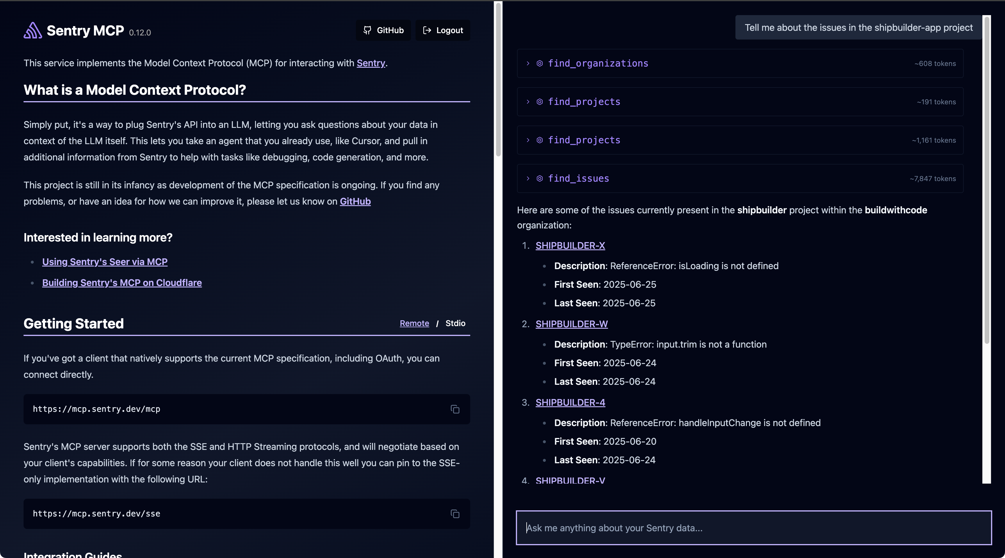 - OAuth support - Authenticate using your existing Sentry organization for seamless access to your projects